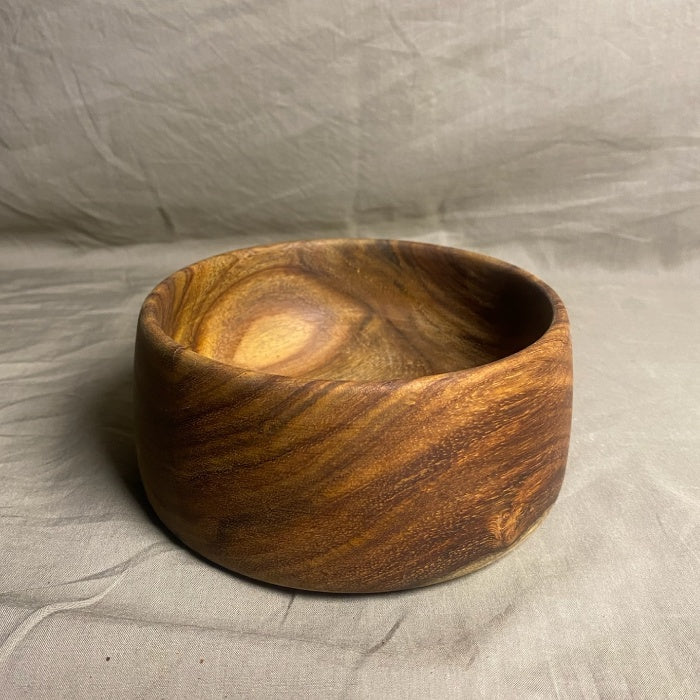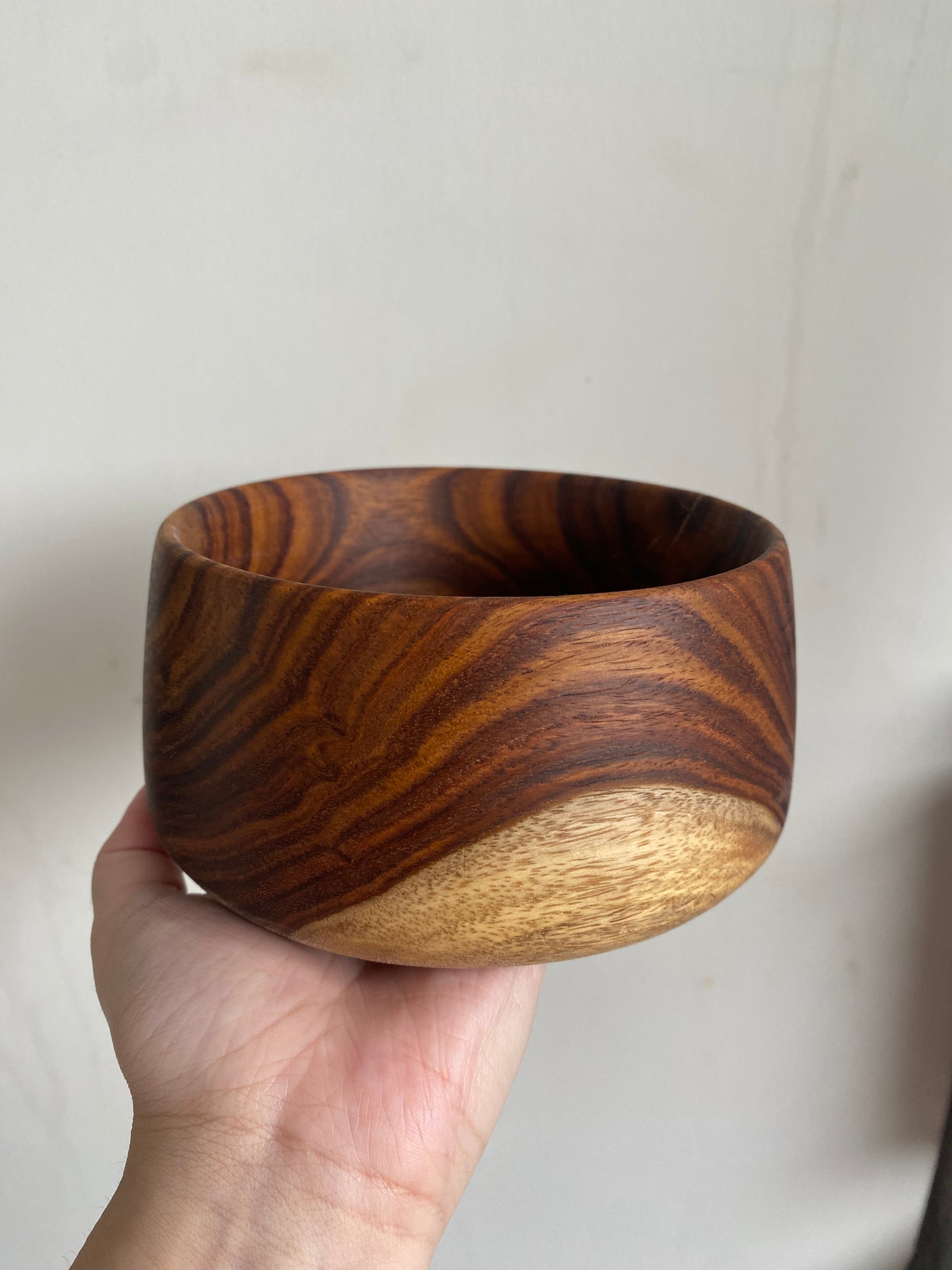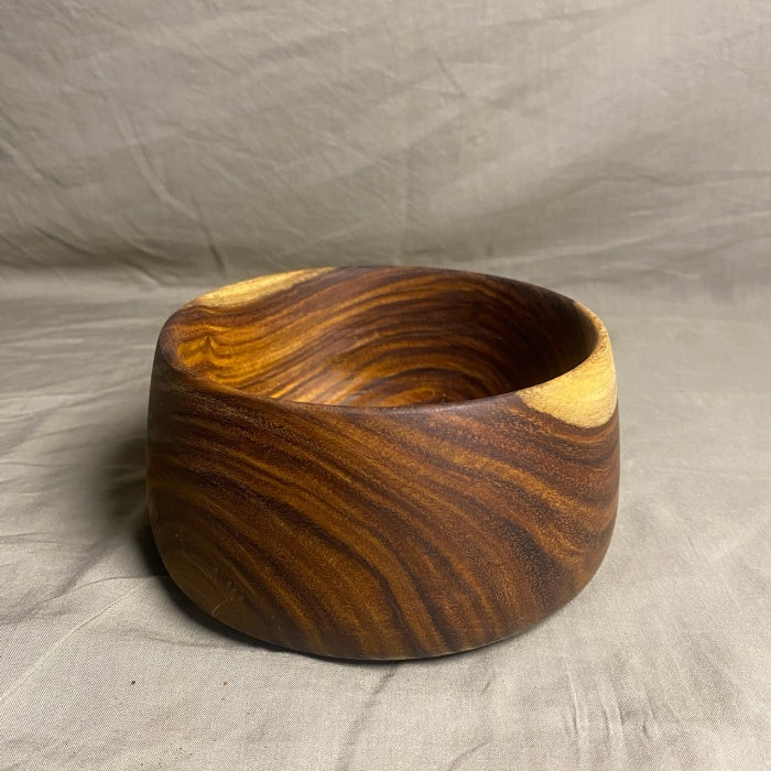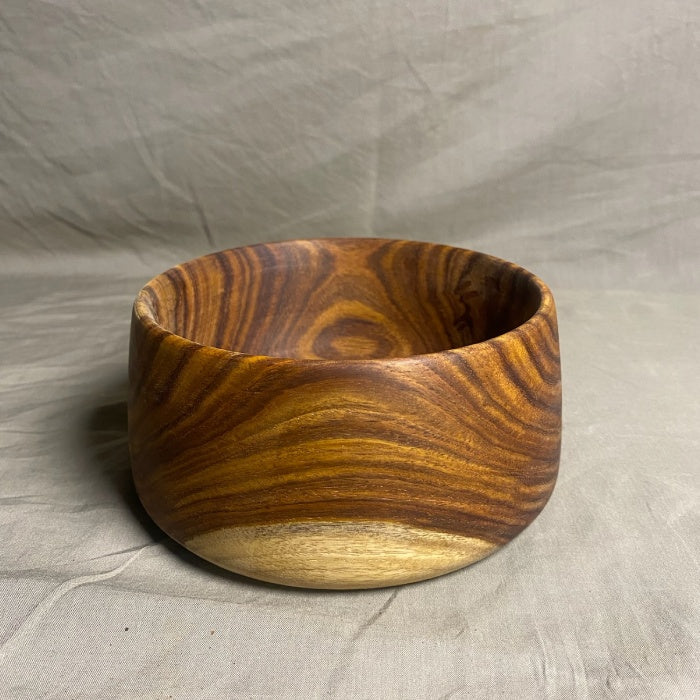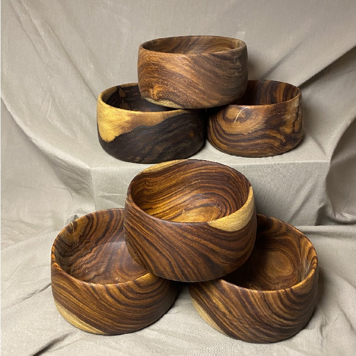 Each bowl is one-of-a-kind, showcasing unique color variations and patterns inherent to rosewood. They are handcrafted from sustainably sourced materials and polished with care to highlight the wood's natural beauty.